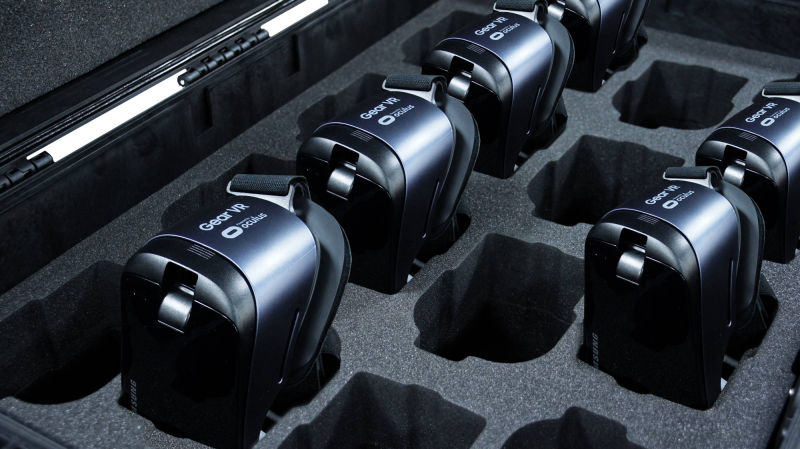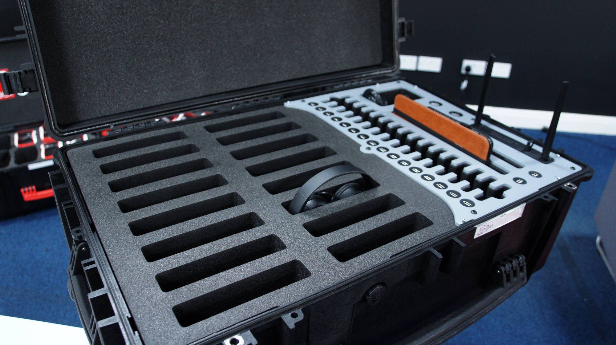 16 bay Samsung Gear VR & controller storage case plus 16 bay phone & tablet intelligent charging with integrated router and storage for 16 Sony MDR-ZX headphones.